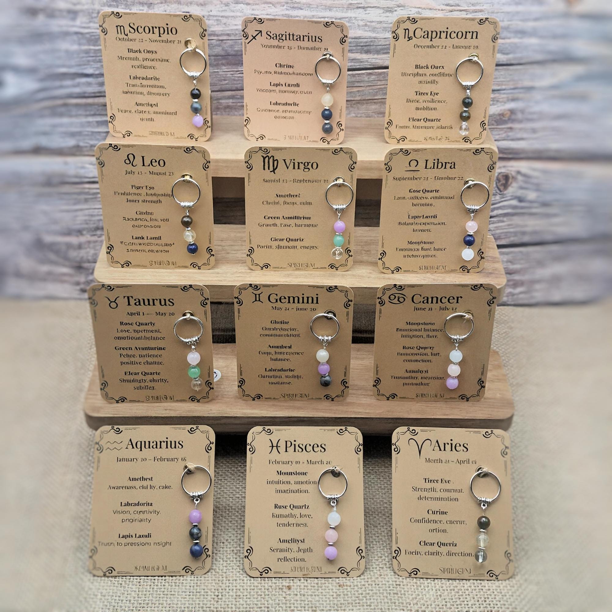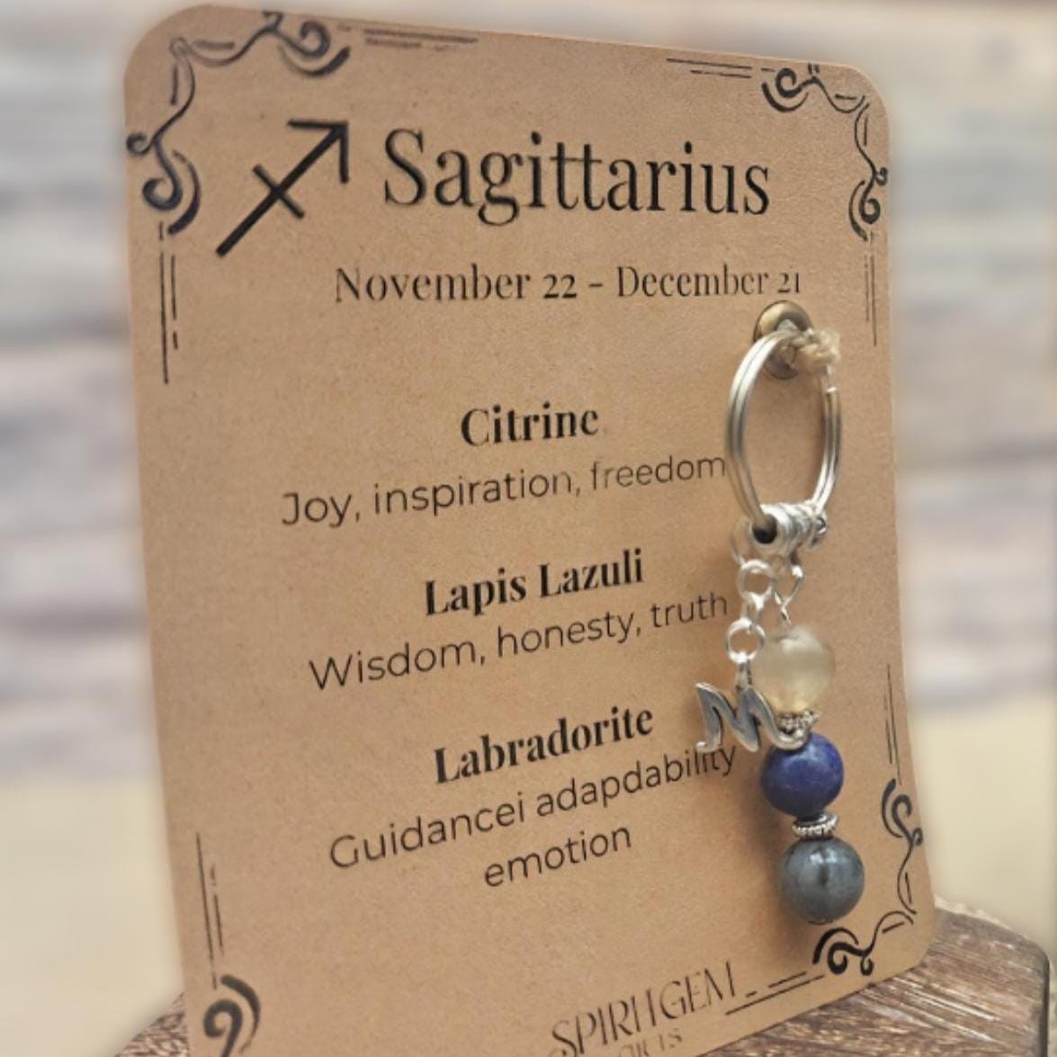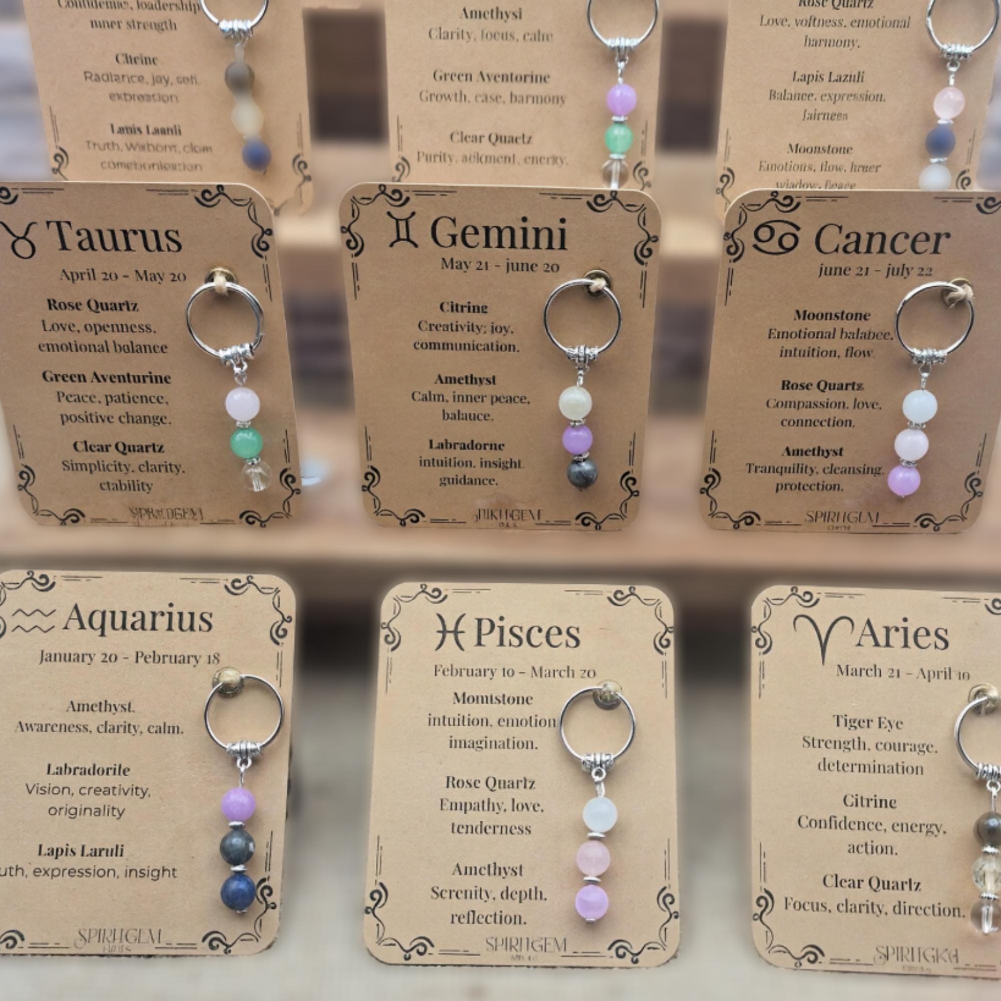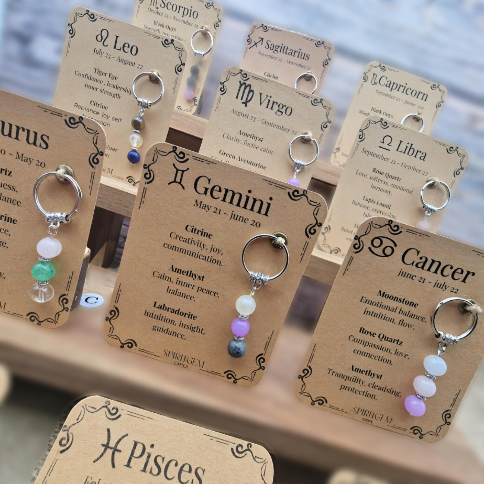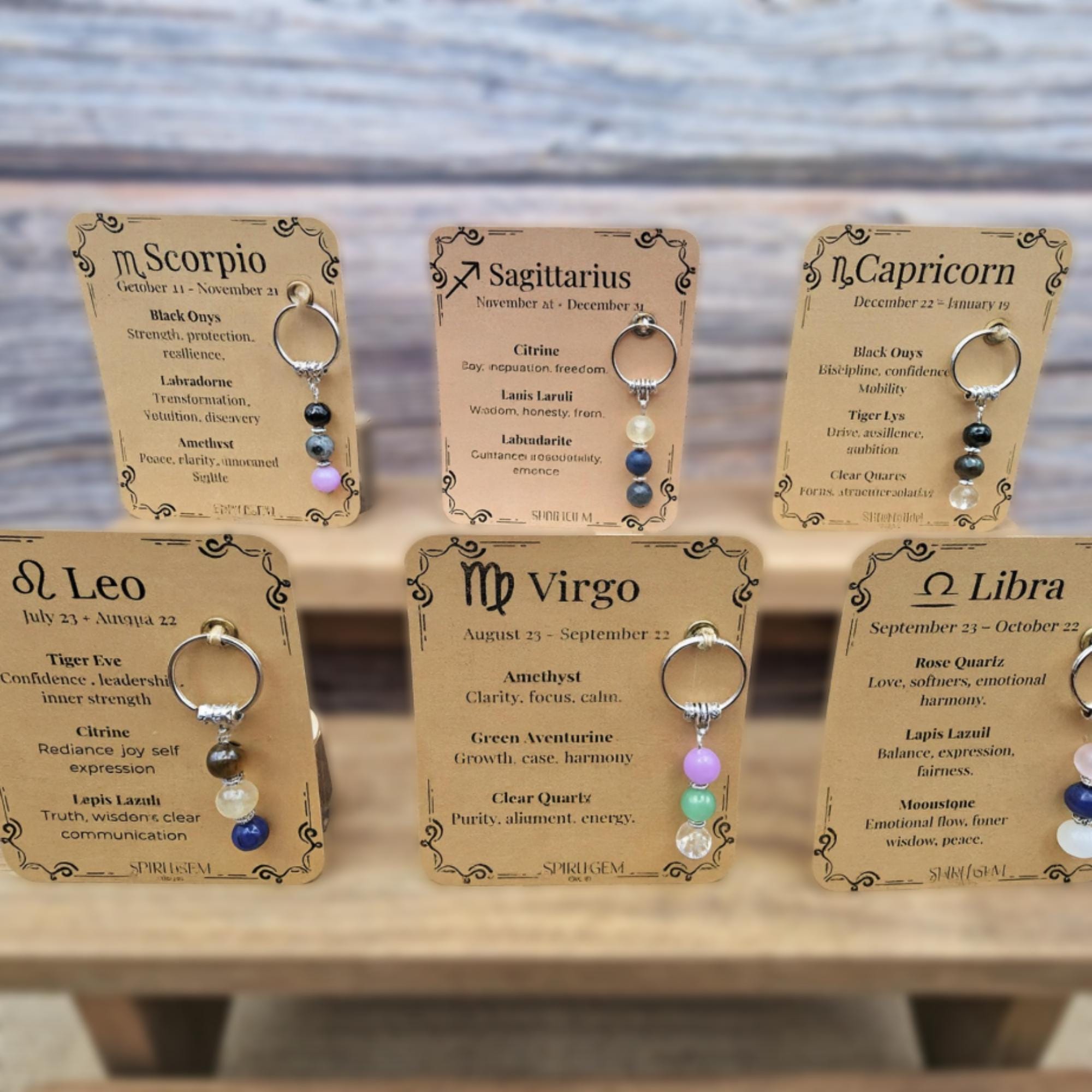 Each keyring features three sparkling 8mm gemstones carefully matched to your zodiac sign and comes with a printed meaning card that explains the energy behind each stone. The keyring measures approximately 60 mm and is lightweight, making it perfect for keys, backpacks or as a spiritual charm and unique bag accessory.