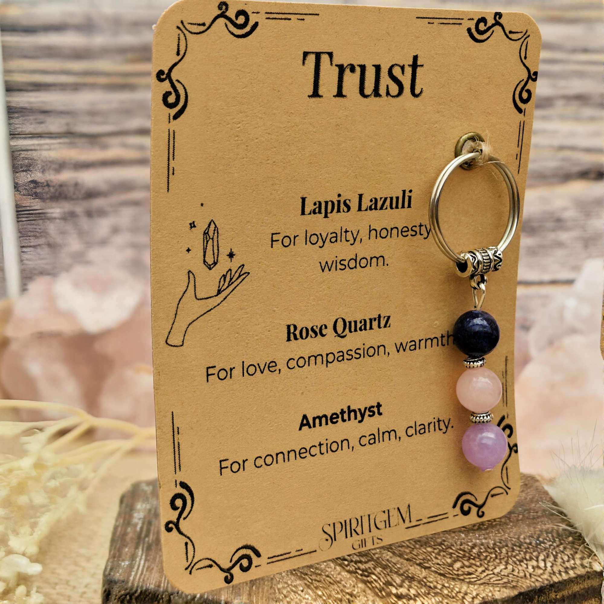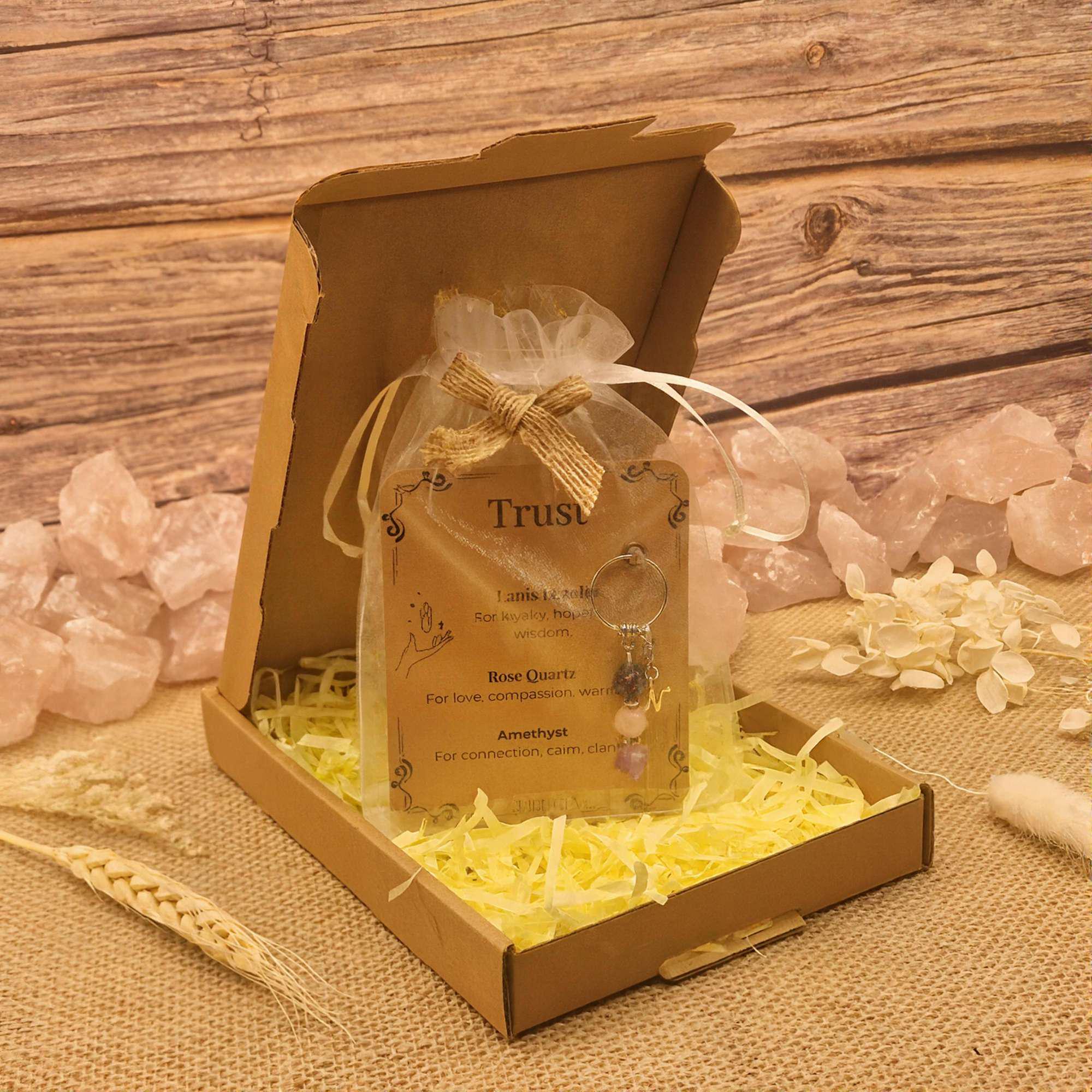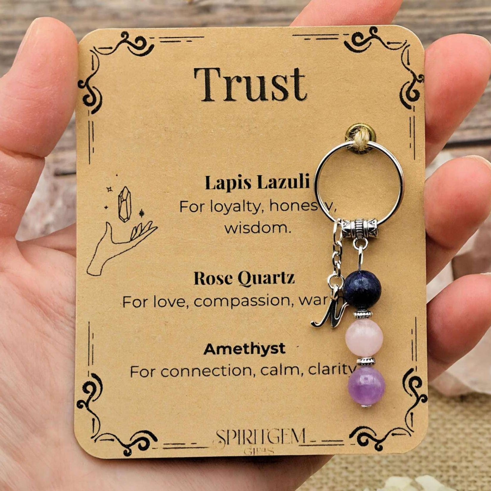 This meaningful keyring is created as a gentle reminder of trust, honesty and deep connection. It represents loyalty, compassion and calm clarity, supporting emotional balance and sincere bonds. It can be kept as a personal symbol or given to someone special to represent trust and understanding. You can also choose to add an initial if you would like it to feel more personal. It arrives in a sheer organza bag with a kraft toned ribbon, ready to gift.